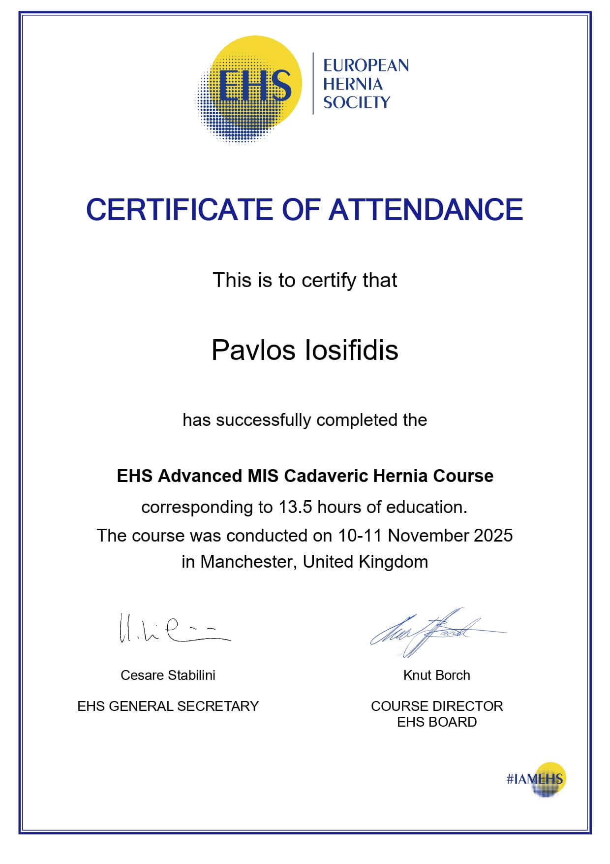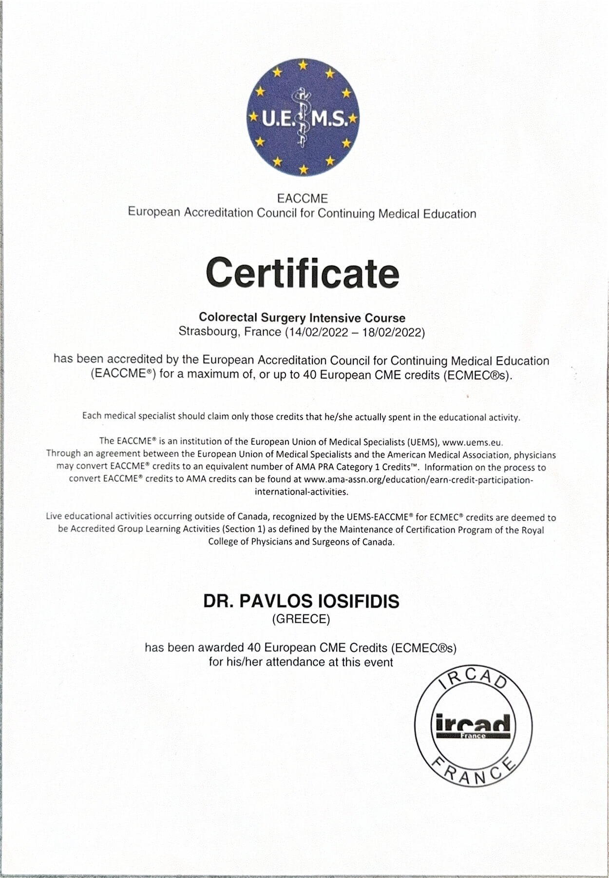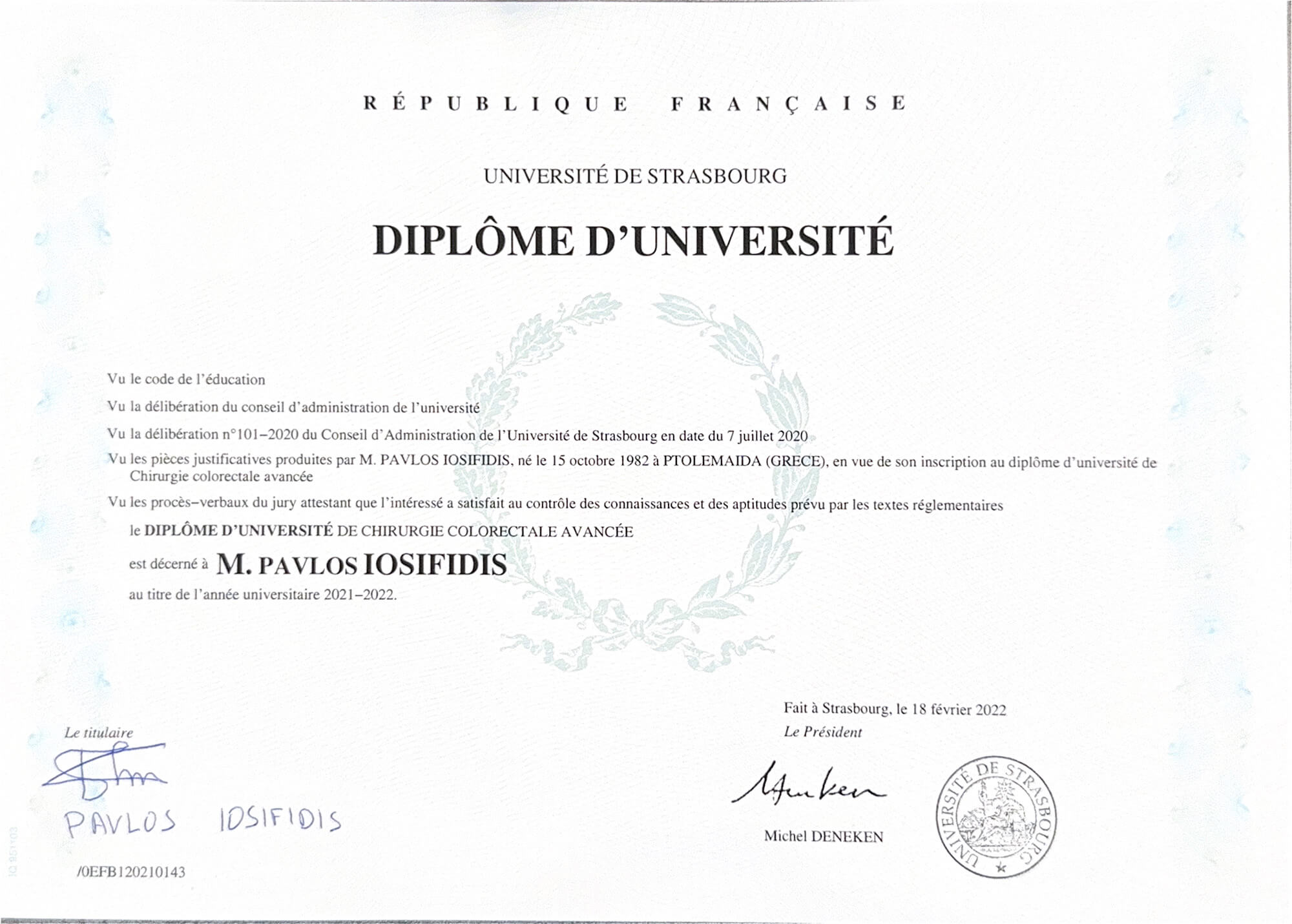 Κάτοχος του Diplôme d’Université de Chirurgie Colorectale Avancée από το Πανεπιστήμιο του Στρασβούργου (Γαλλία, 2022), ενισχύοντας περαιτέρω την εξειδίκευσή του στη χειρουργική παχέος εντέρου και ορθού.