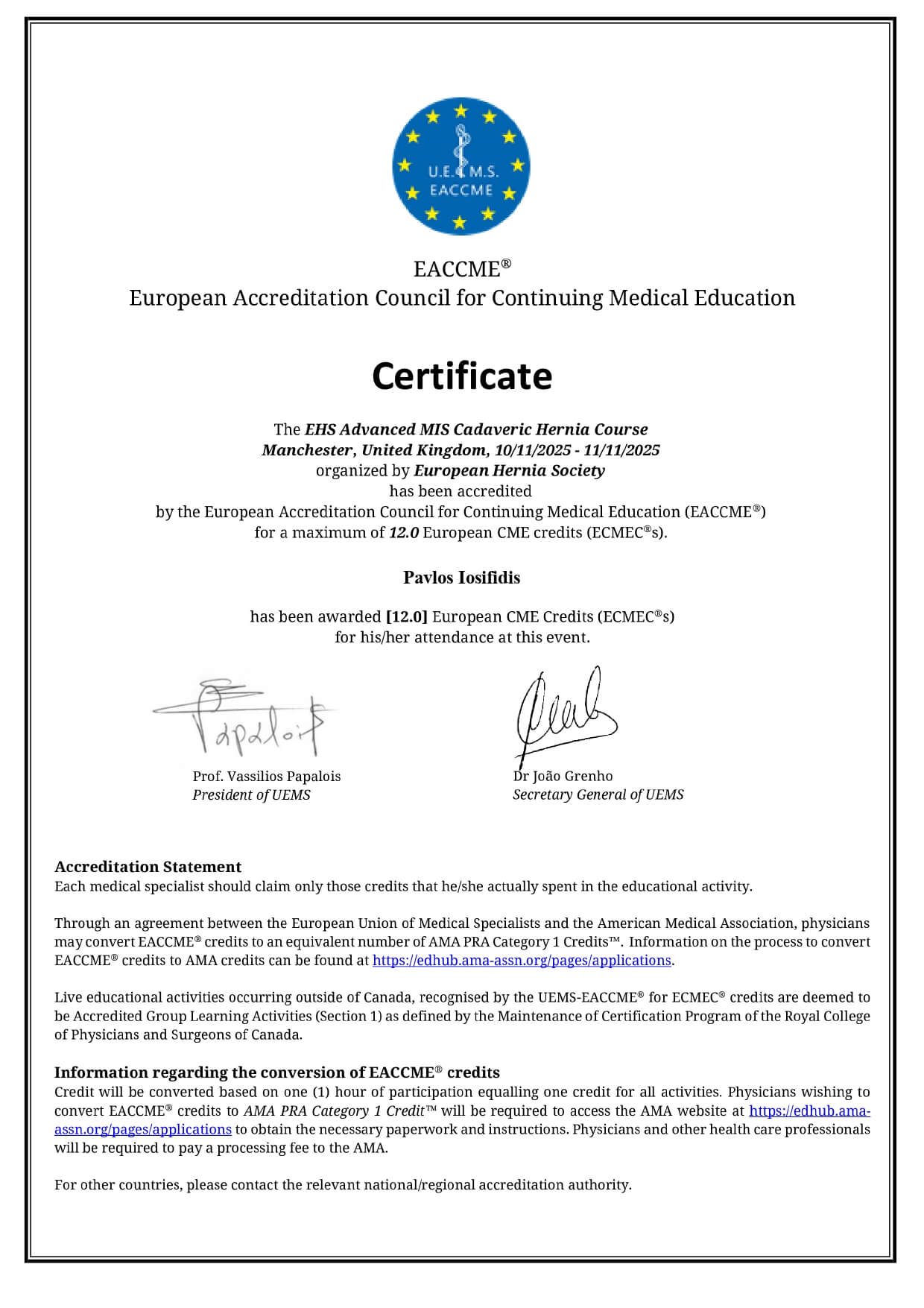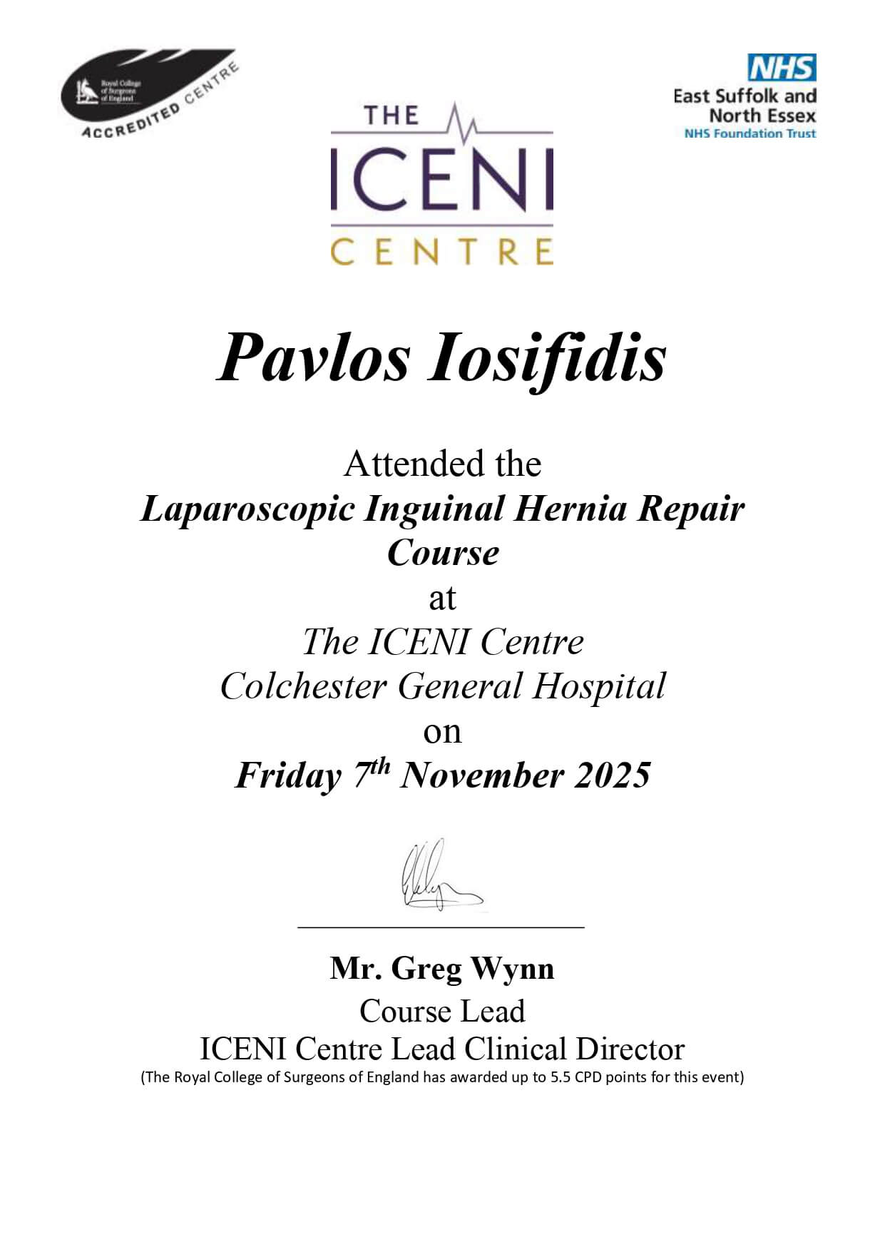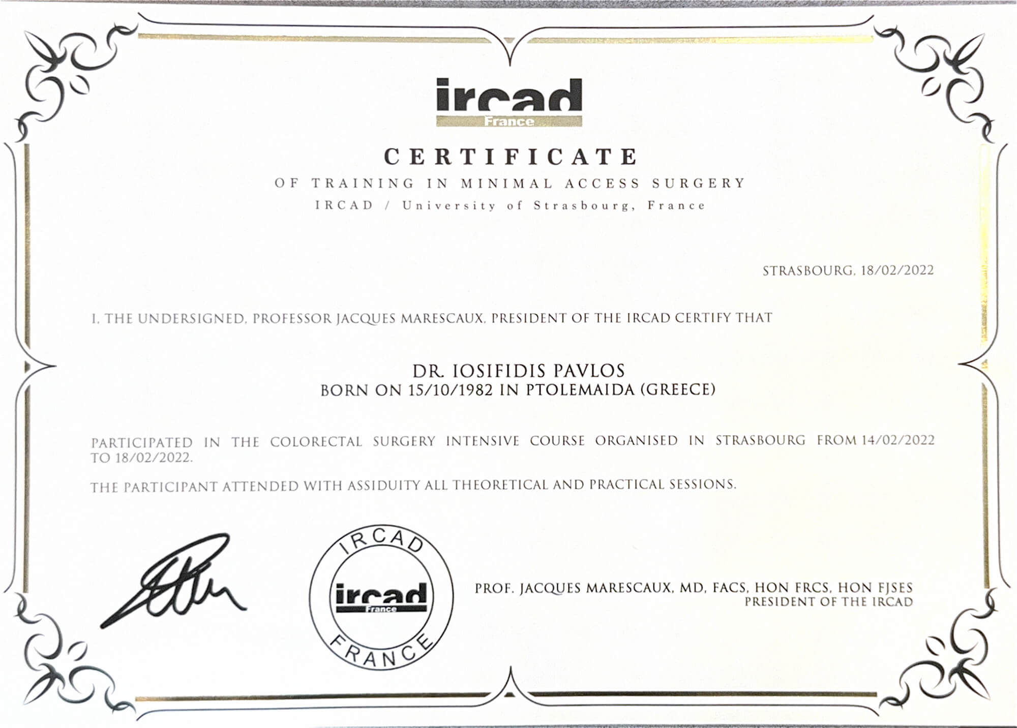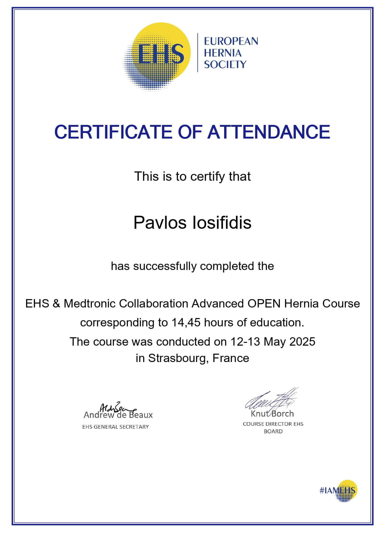 Κάτοχος του Diplôme d’Université de Chirurgie Colorectale Avancée από το Πανεπιστήμιο του Στρασβούργου (Γαλλία, 2022), ενισχύοντας περαιτέρω την εξειδίκευσή του στη χειρουργική παχέος εντέρου και ορθού.